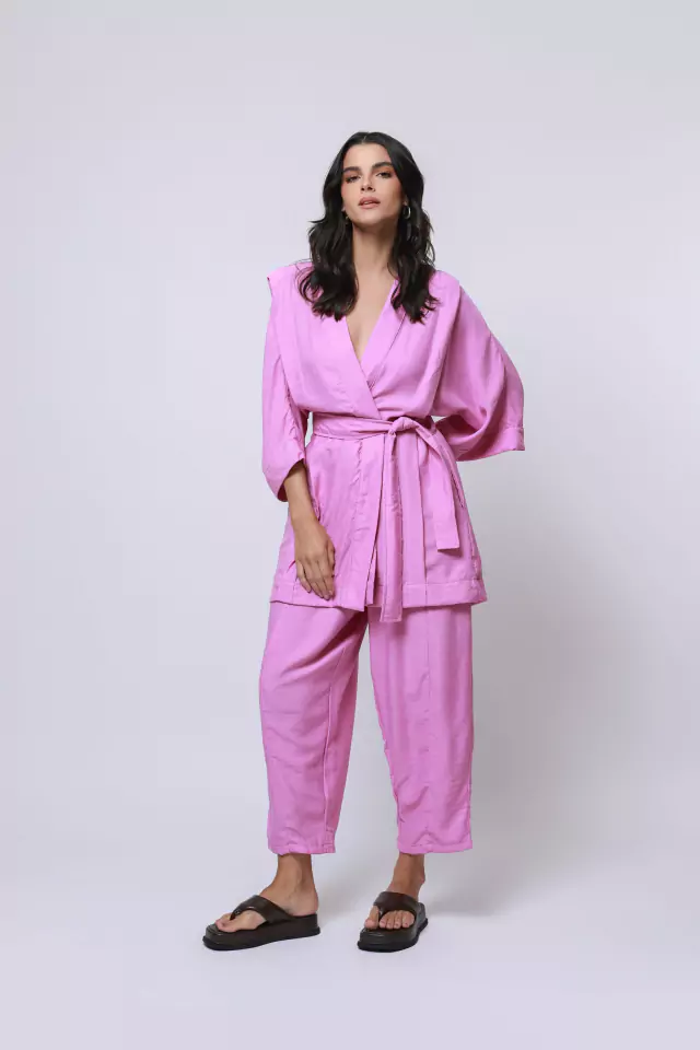 Modelo de calça com modelagem confortável e formato ovalado. Possui emendas frontais para dar o caimento perfeito, cintura alta em elástico 3cm e possui bolsos laterais.