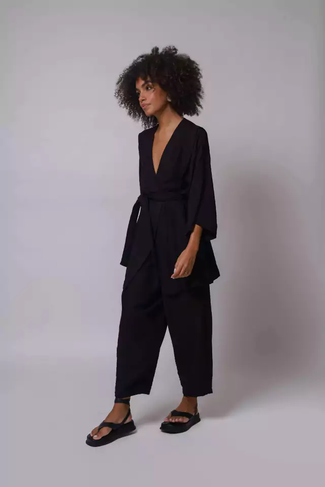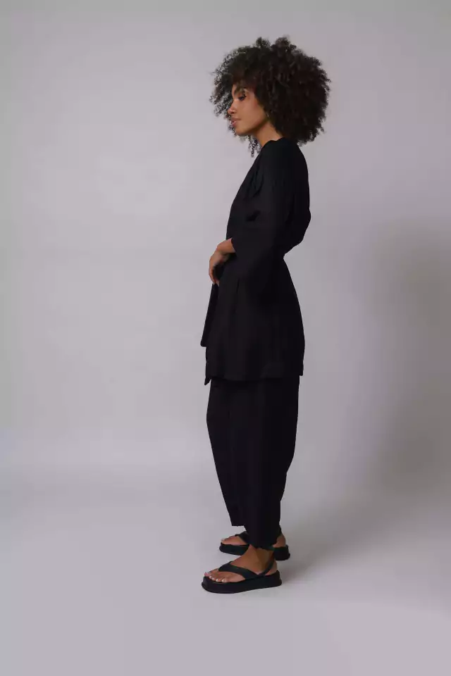 Modelo de calça com modelagem confortável e formato ovalado. Possui emendas frontais para dar o caimento perfeito, cintura alta em elástico 3cm e possui bolsos laterais.