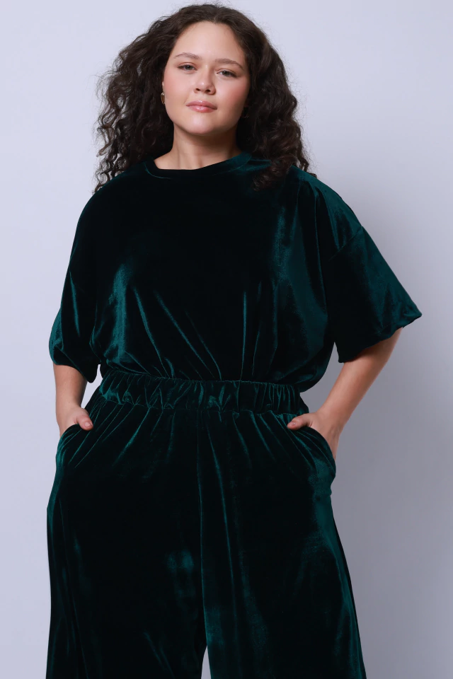 A Calça Lagoa tem modelagem ampla, cintura alta com cós em elástico para maior conforto e bolsos laterais funcionais. O tecido em veludo de viscose com gramatura média garante presença sem perder a leveza no movimento.