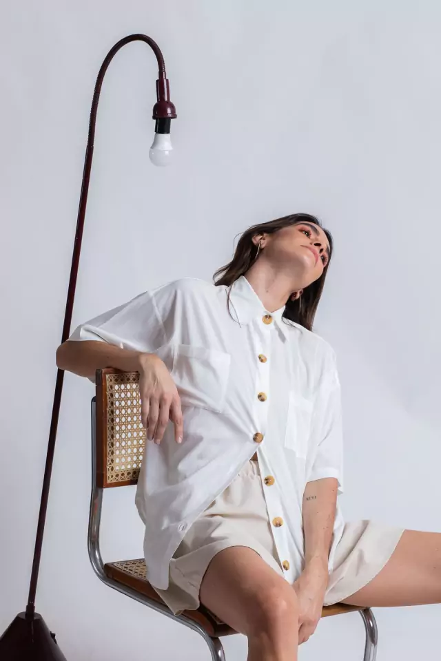 Camisa com modelagem solta, barra levemente arredondada e bolsos frontais.