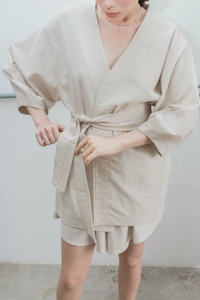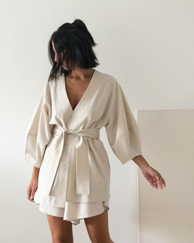 Ele possui decote "V", bolsos laterais com detalhe pespontado, passantes e acompanha uma faixa pespontada tipo "obi" como opção para usar a peça acinturada. O Kimono Cocoon vai do clássico ao despojado, sempre facilitando na escolha do seu look.